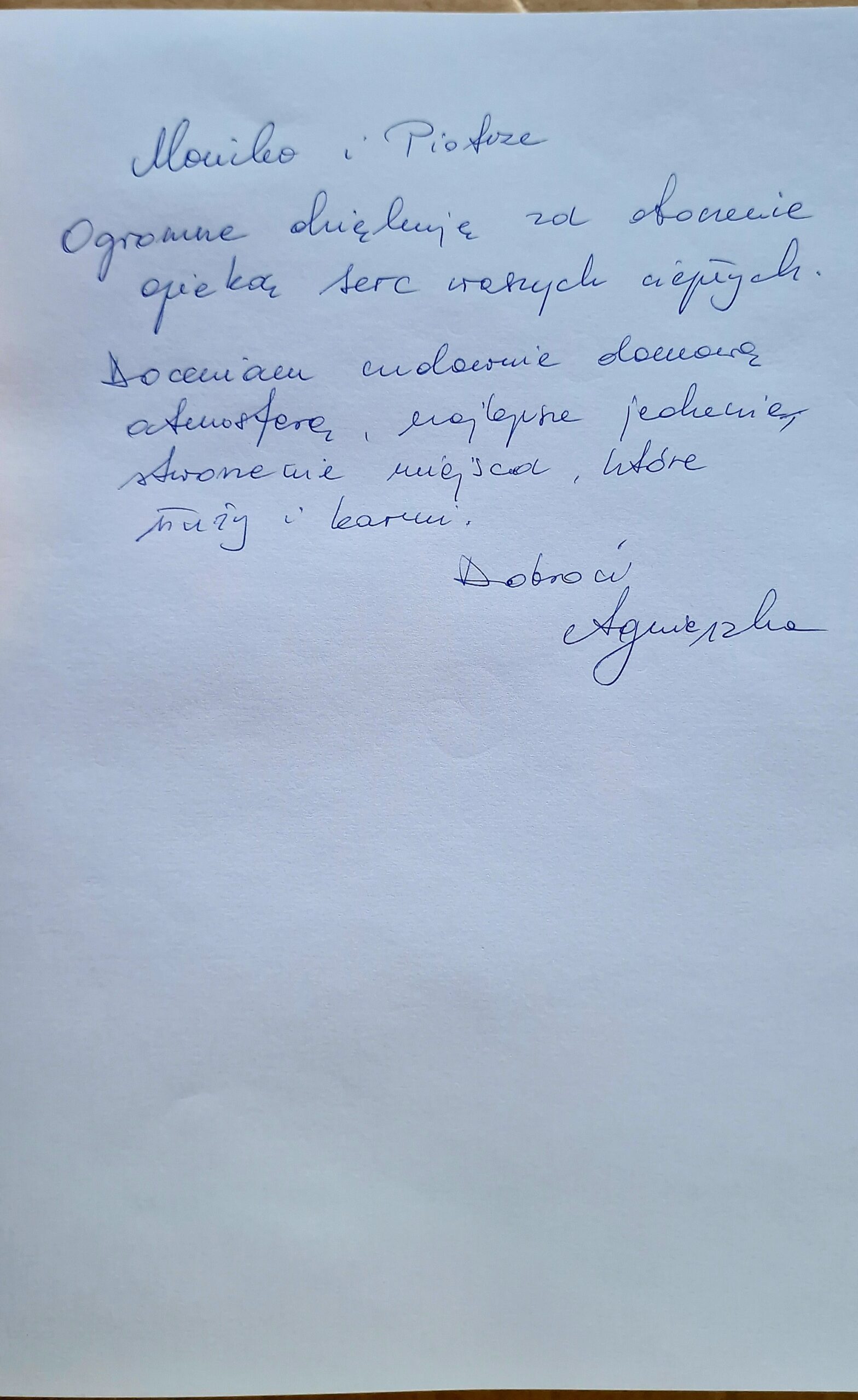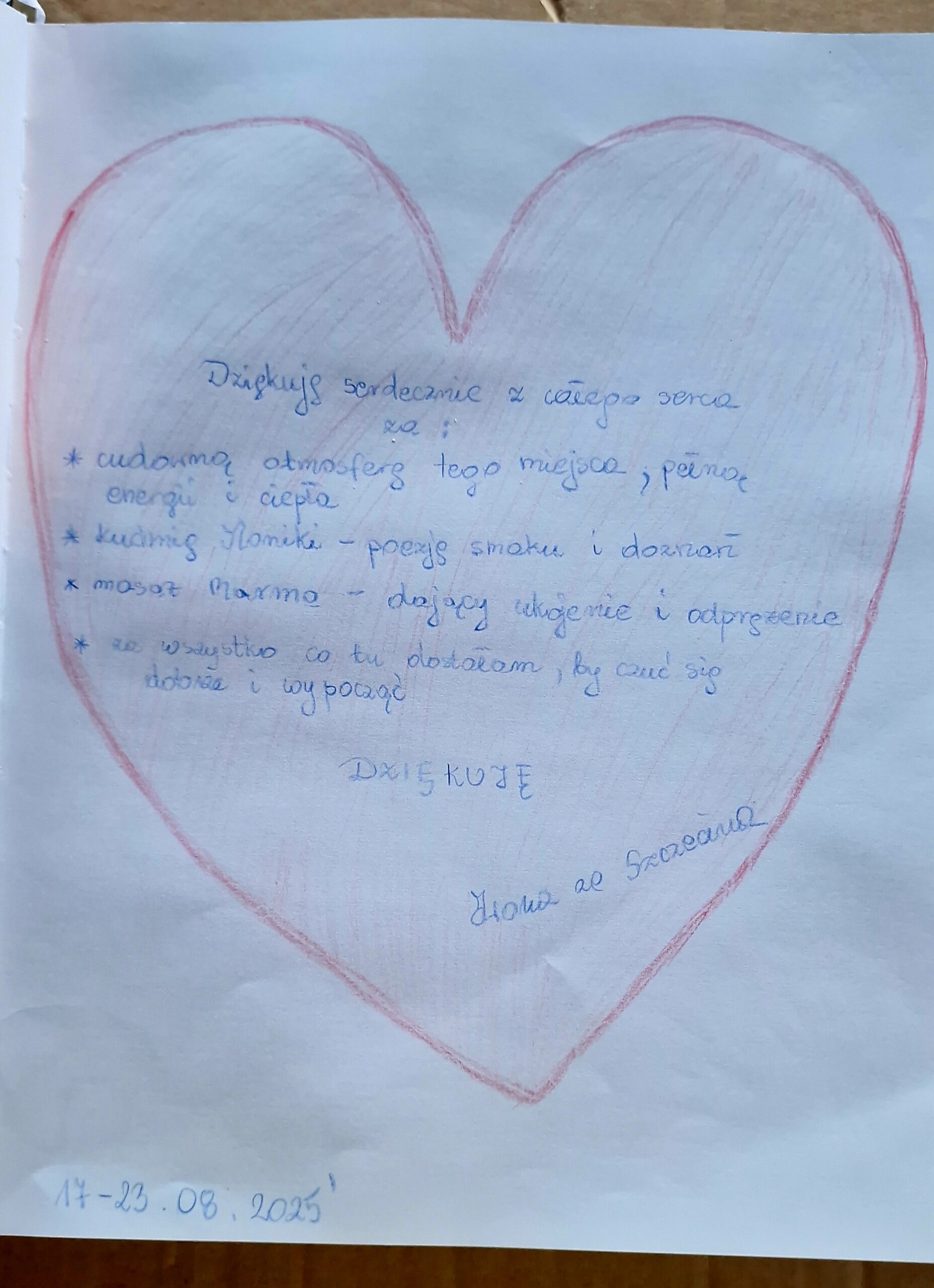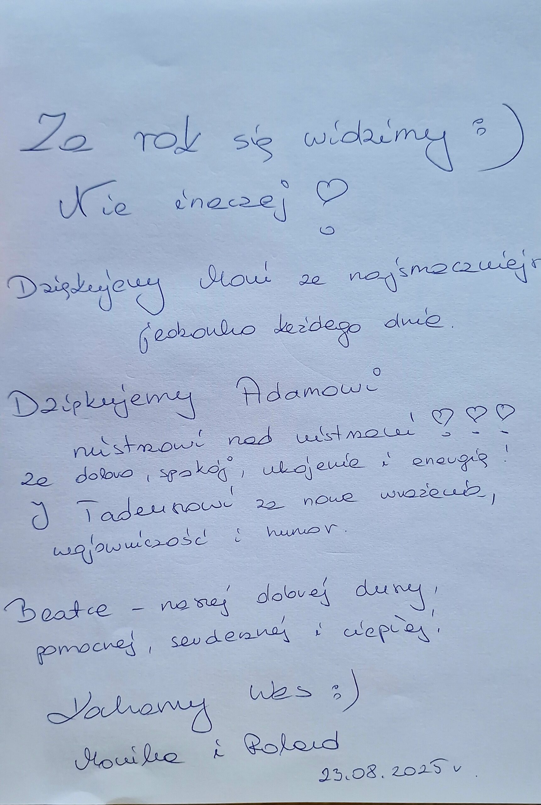 Dziękuję, że przyjeżdżacie do nas, że wracacie z uśmiechem. A kiedy wyjeżdżacie- widzimy w Was więcej światła, więcej spokoju, więcej życia.